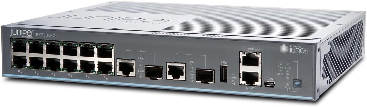 The Juniper EX2200-C-12T-2G switch features a robust design with various ports and indicators on its front panel.