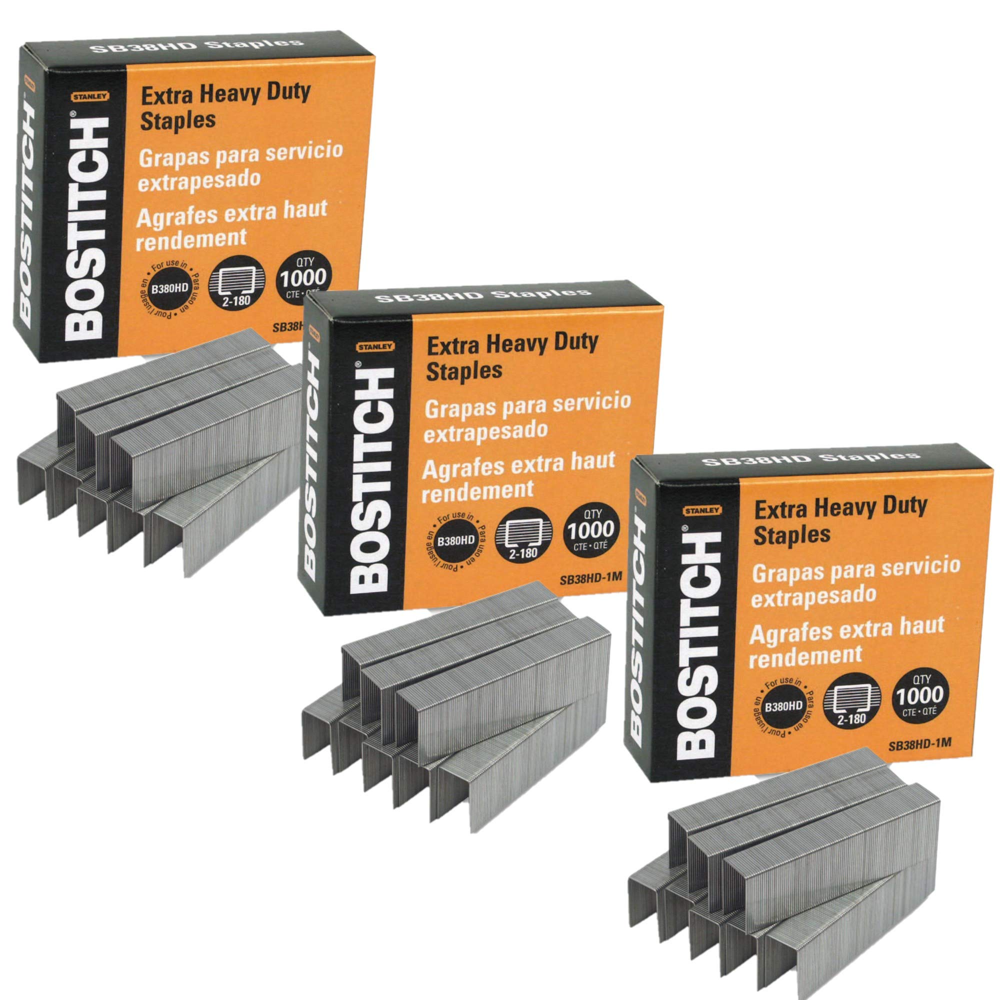 Image: Bostitch SB38HD-1M Heavy Duty Premium Staples, showing the product packaging and several strips of staples. The box indicates "Extra Heavy Duty Staples" and "For use in B380HD" staplers, with a capacity of "2-180" sheets and a quantity of "1000" staples.