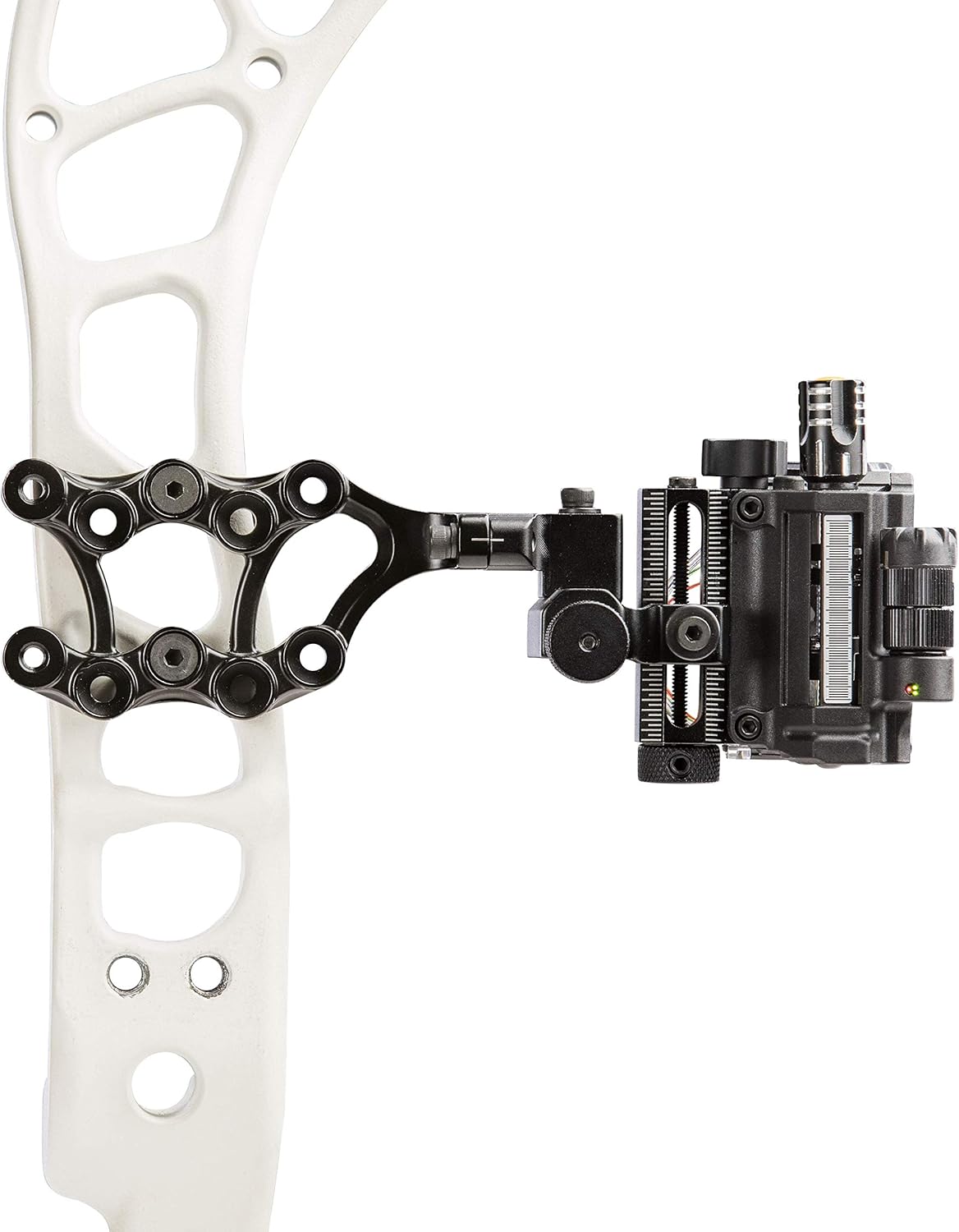 Partea asta view of the sight mounted on a bow demonstrates the profile of the sight and its various adjustment knobs, including the tool-less knob for the third pin.