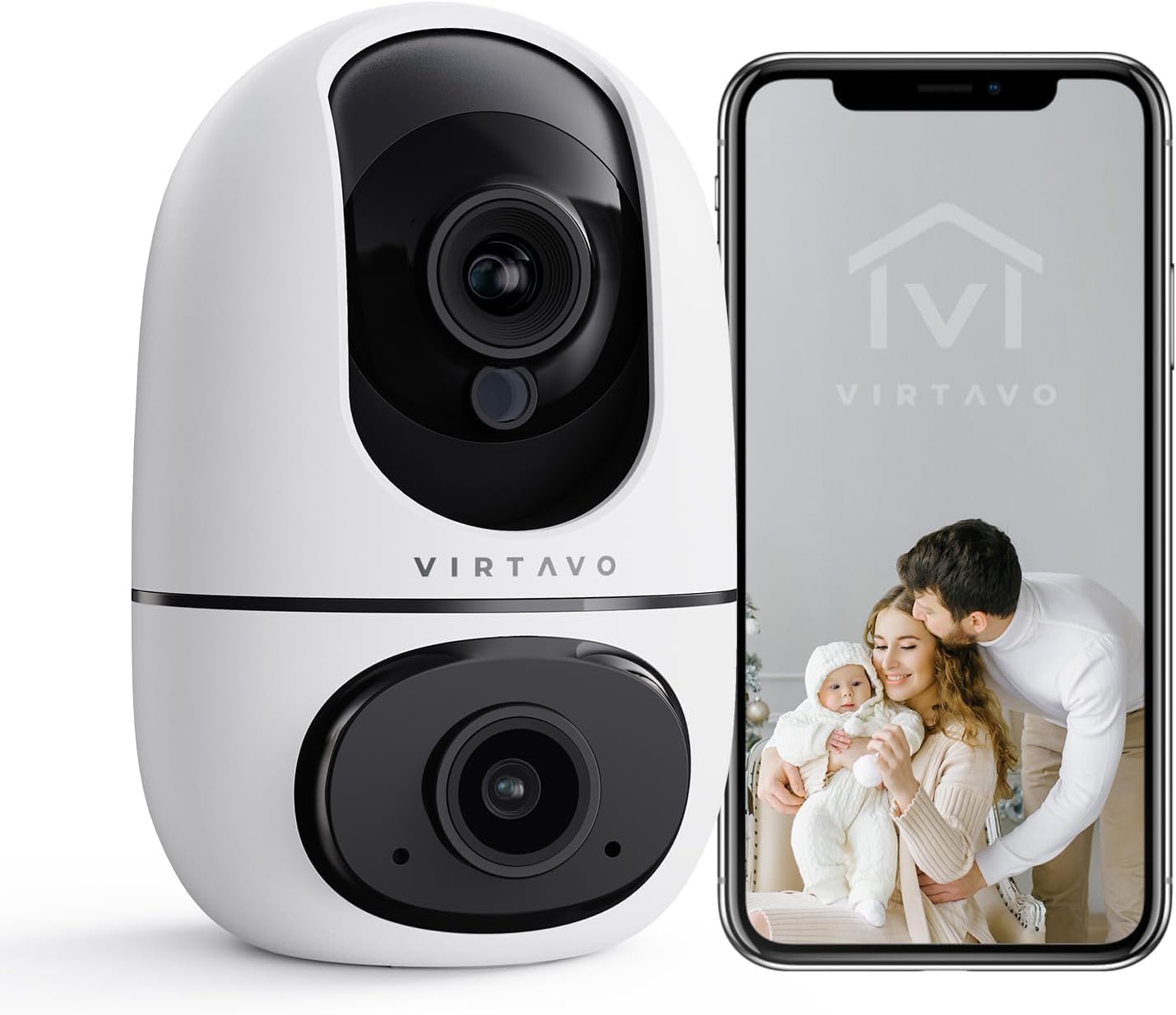The virtavo Indoor WiFi Security Camera features a dual-lens design, providing enhanced monitoring capabilities. It supports 1080p resolution, pan and tilt functionality for 360-degree coverage, two-way audio, and advanced detection features.